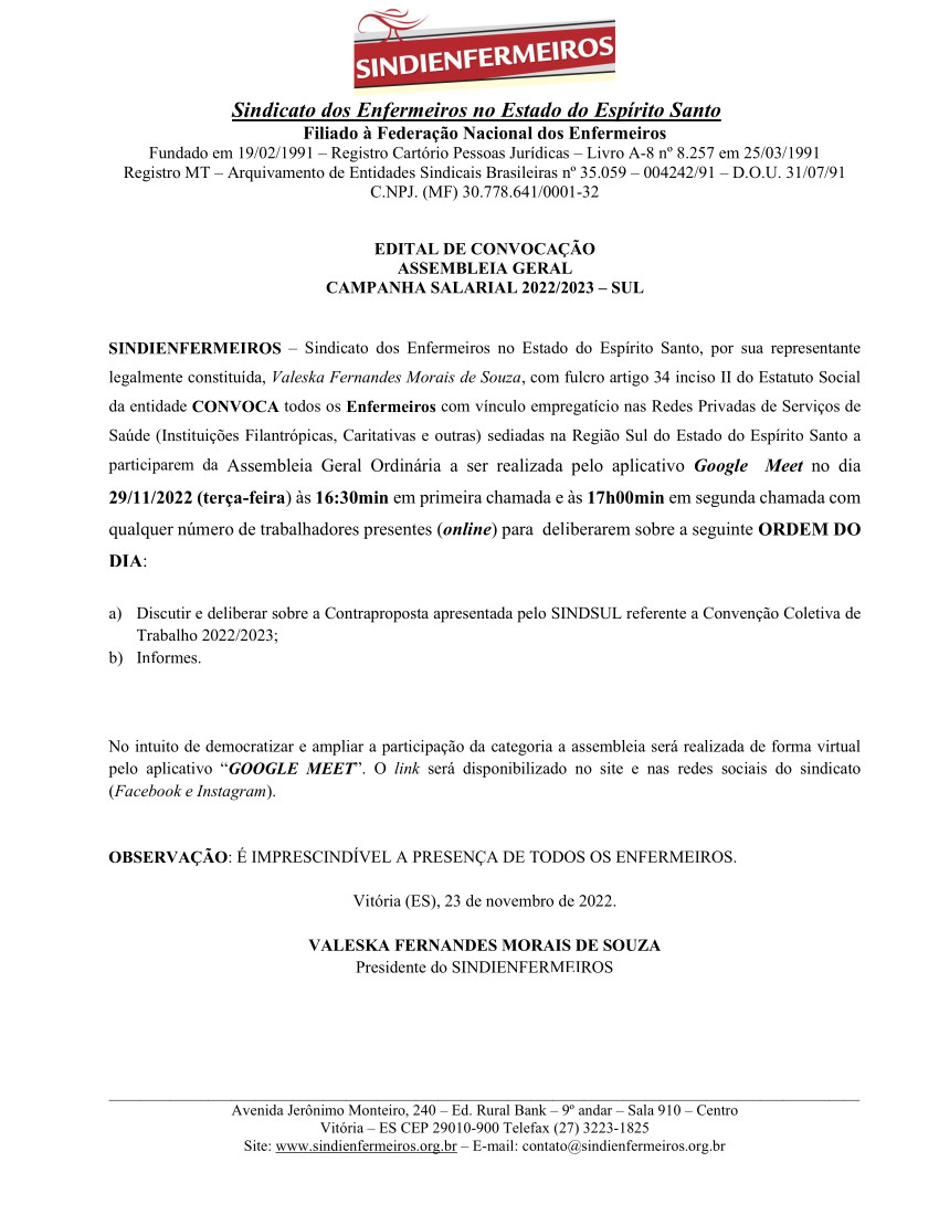 SINDIENFERMEIROS – Sindicato dos Enfermeiros no Estado do Espírito Santo, por sua representante legalmente constituída, Valeska Fernandes Morais de Souza, com fulcro artigo 34 inciso II do Estatuto Social da entidade CONVOCA todos os Enfermeiros da AFPESP, a participarem da Assembleia Geral Extraordinária que será realizada pelo aplicativo Google Meet no dia 24/04/2023 (segunda-feira) às 16h00min.