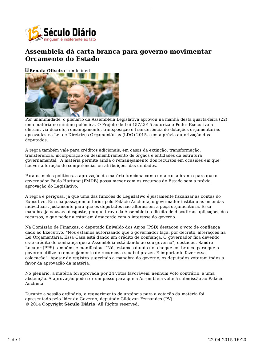 Por unanimidade, o plenário da Assembleia Legislativa aprovou na manhã desta quarta-feira (22) uma matéria no mínimo polêmica. O Projeto de Lei 157/2015 autoriza o Poder Executivo a efetuar, via decreto, remanejamento, transposição e transferência de dotações orçamentárias aprovadas na Lei de Diretrizes Orçamentárias (LDO) 2015, sem a prévia autorização dos deputados.