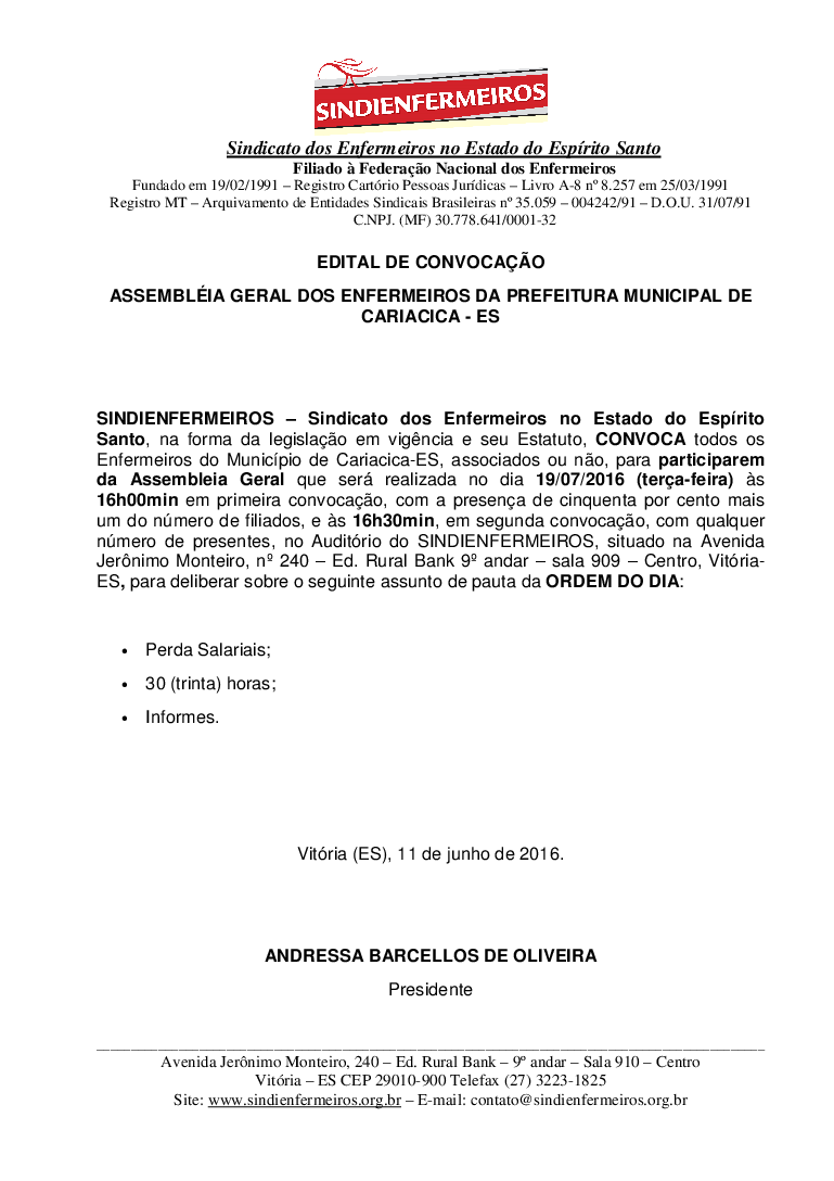 SINDIENFERMEIROS – Sindicato dos Enfermeiros no Estado do Espírito Santo, na forma da legislação em vigência e seu Estatuto, CONVOCA todos os Enfermeiros do Município de Cariacica-ES, associados ou não, para participarem da Assembleia Geral que será realizada no dia 19/07/2016 (terça-feira) às 16h00min.