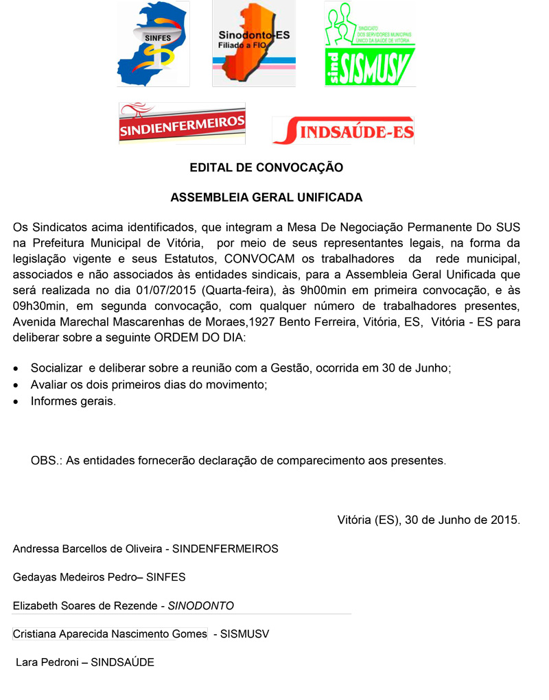 Os Sindicatos acima identificados, que integram a Mesa De Negociação Permanente Do SUS na Prefeitura Municipal de Vitória, por meio de seus representantes legais, na forma da legislação vigente e seus Estatutos, CONVOCAM os trabalhadores da rede municipal, associados e não associados às entidades sindicais, para a Assembleia Geral Unificada que será realizada no dia 01/07/2015 (Quarta-feira), às 9h00min em primeira convocação, e às 09h30min, em segunda convocação, com qualquer número de trabalhadores presentes, Avenida Marechal Mascarenhas de Moraes,1927 Bento Ferreira, Vitória, ES, Vitória - ES.