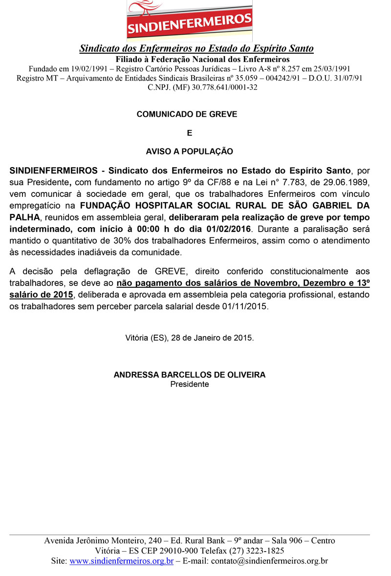SINDIENFERMEIROS - Sindicato dos Enfermeiros no Estado do Espírito Santo, por sua Presidente, com fundamento no artigo 9º da CF/88 e na Lei n° 7.783, de 29.06.1989, vem comunicar à sociedade em geral, que os trabalhadores Enfermeiros com vínculo empregatício na FUNDAÇÃO HOSPITALAR SOCIAL RURAL DE SÃO GABRIEL DA PALHA, reunidos em assembleia geral, deliberaram pela realização de greve por tempo indeterminado, com início à 00:00 h do dia 01/02/2016.