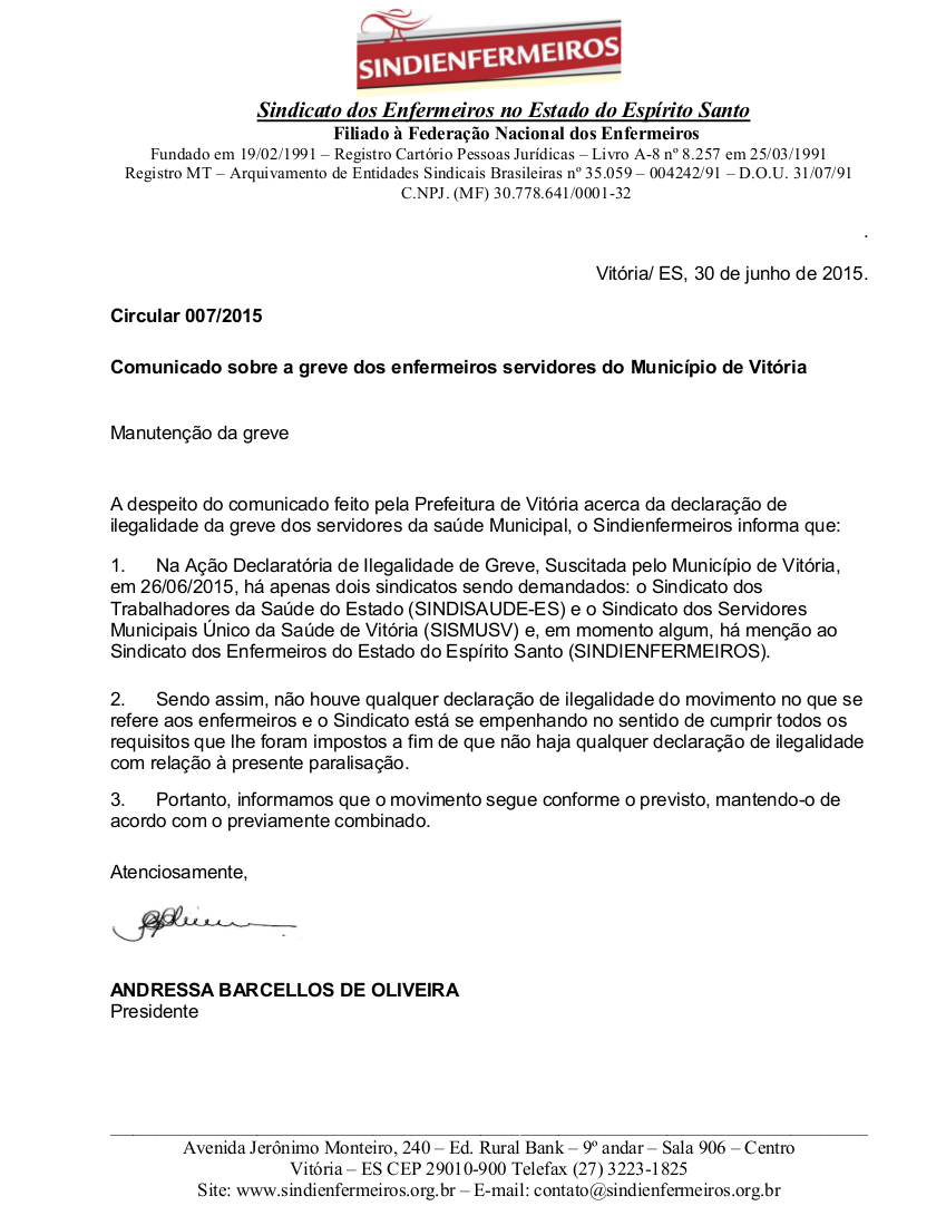 Na Ação Declaratória de Ilegalidade de Greve, Suscitada pelo Município de Vitória, em 26/06/2015, há apenas dois sindicatos sendo demandados: o Sindicato dos Trabalhadores da Saúde do Estado (SINDISAUDE-ES) e o Sindicato dos Servidores Municipais Único da Saúde de Vitória (SISMUSV) e, em momento algum, há menção ao Sindicato dos Enfermeiros do Estado do Espírito Santo (SINDIENFERMEIROS).