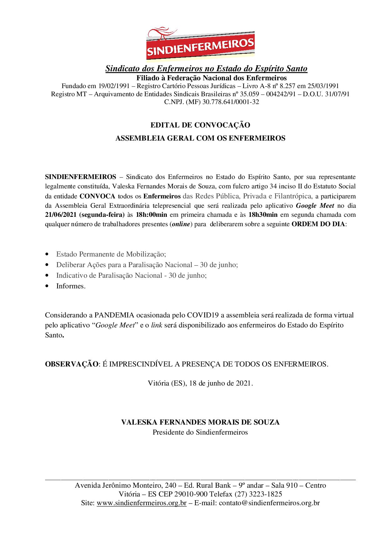 SINDIENFERMEIROS – Sindicato dos Enfermeiros no Estado do Espírito Santo, por sua representante legalmente constituída, Valeska Fernandes Morais de Souza, com fulcro artigo 34 inciso II do Estatuto Social da entidade CONVOCA todos os Enfermeiros das Redes Pública, Privada e Filantrópica, a participarem da Assembleia Geral Extraordinária telepresencial que será realizada pelo aplicativo Google Meet no dia 21/06/2021 (segunda-feira) às 18h:00.