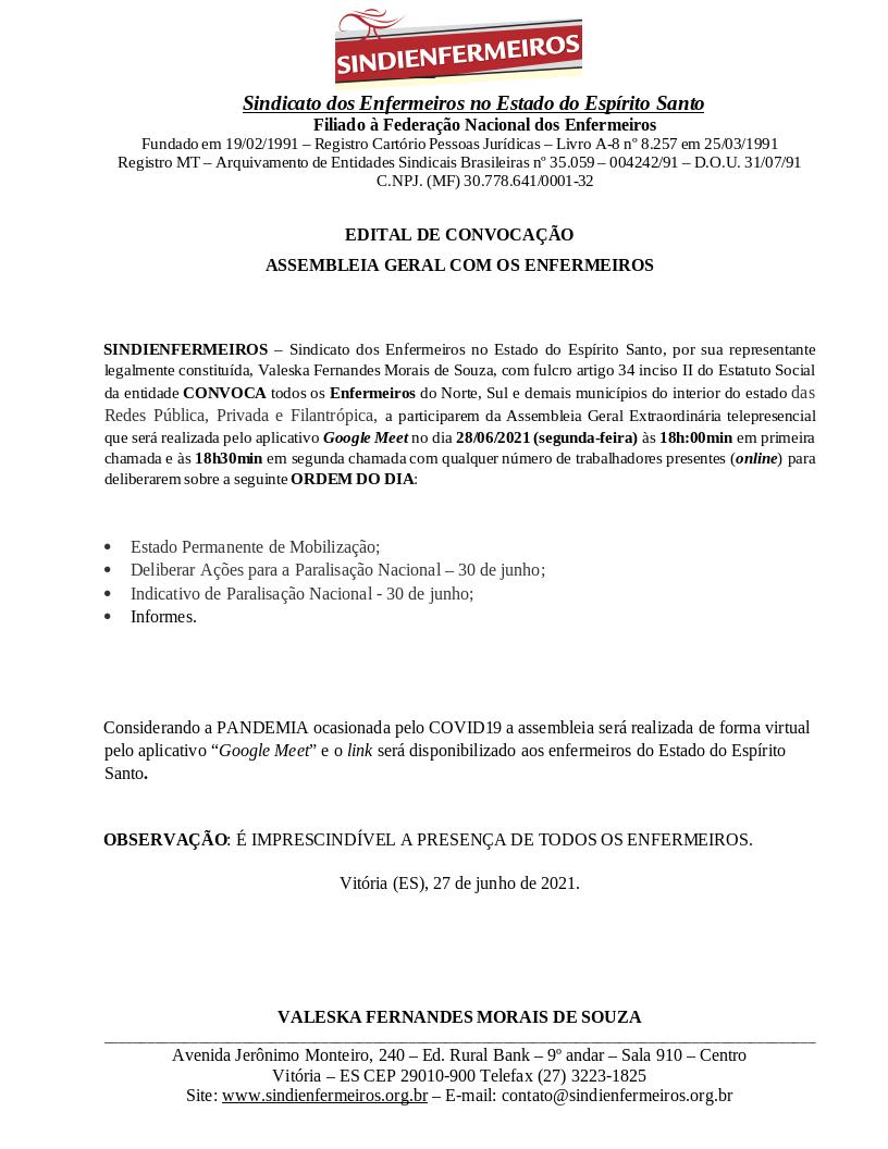 SINDIENFERMEIROS – Sindicato dos Enfermeiros no Estado do Espírito Santo, por sua representante legalmente constituída, Valeska Fernandes Morais de Souza, com fulcro artigo 34 inciso II do Estatuto Social da entidade CONVOCA todos os Enfermeiros do Norte, Sul e demais municípios do interior do estado das Redes Pública, Privada e Filantrópica, a participarem da Assembleia Geral Extraordinária telepresencial que será realizada pelo aplicativo Google Meet no dia 28/06/2021 (segunda-feira) às 18h:00