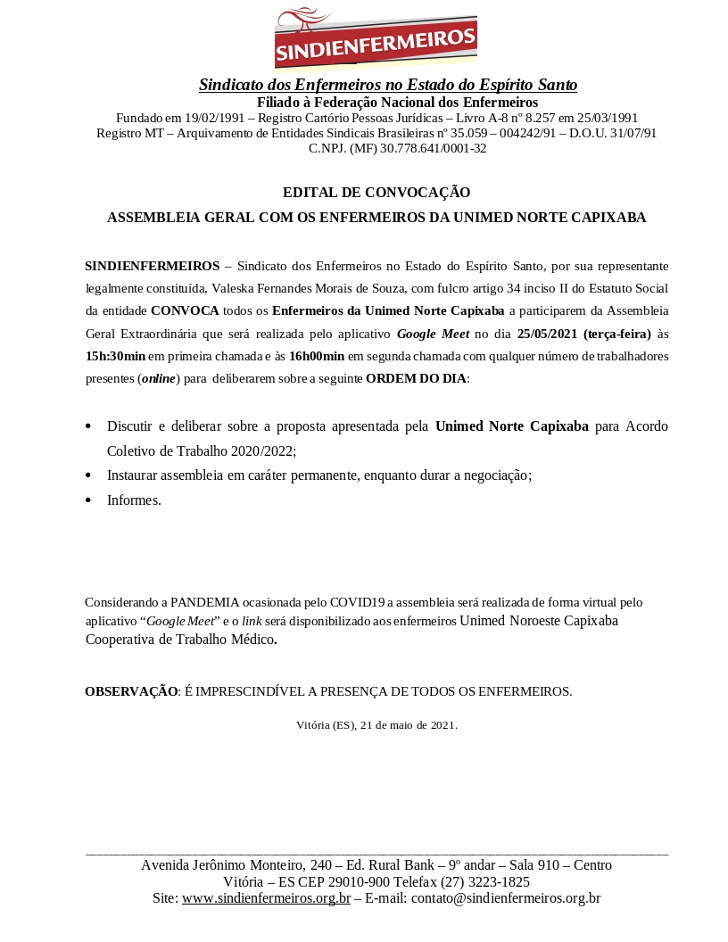INDIENFERMEIROS – Sindicato dos Enfermeiros no Estado do Espírito Santo, por sua representante legalmente constituída, Valeska Fernandes Morais de Souza, com fulcro artigo 34 inciso II do Estatuto Social da entidade CONVOCA todos os Enfermeiros da Unimed Norte Capixaba a participarem da Assembleia Geral Extraordinária que será realizada pelo aplicativo Google Meet no dia 25/05/2021 (terça-feira) às 15h:30.