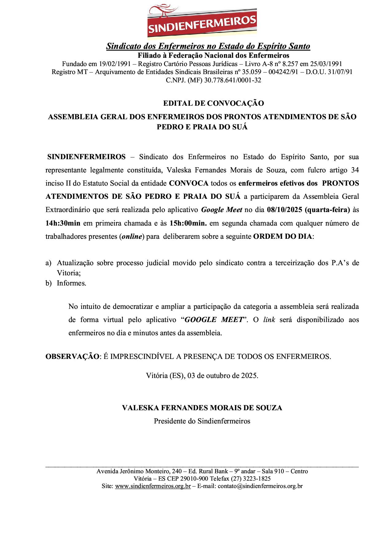 SINDIENFERMEIROS – Sindicato dos Enfermeiros no Estado do Espírito Santo, por sua representante legalmente constituída, Valeska Fernandes Morais de Souza, com fulcro artigo 34 inciso II do Estatuto Social da entidade CONVOCA todos os enfermeiros efetivos dos PRONTOS ATENDIMENTOS DE SÃO PEDRO E PRAIA DO SUÁ a participarem da Assembleia Geral Extraordinário que será realizada pelo aplicativo Google Meet no dia 08/10/2025 (quarta-feira) às 14h:30.