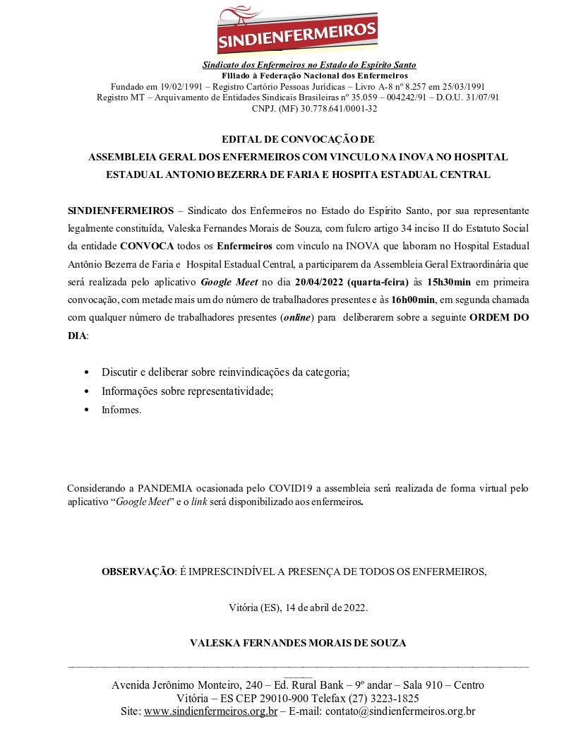 SINDIENFERMEIROS – Sindicato dos Enfermeiros no Estado do Espírito Santo, por sua representante legalmente constituída, Valeska Fernandes Morais de Souza, com fulcro artigo 34 inciso II do Estatuto Social da entidade CONVOCA todos os Enfermeiros com vinculo na INOVA que laboram no Hospital Estadual Antônio Bezerra de Faria e Hospital Estadual Central, a participarem da Assembleia Geral Extraordinária que será realizada pelo aplicativo Google Meet no dia 20/04/2022 (quarta-feira) às 15h30min.
