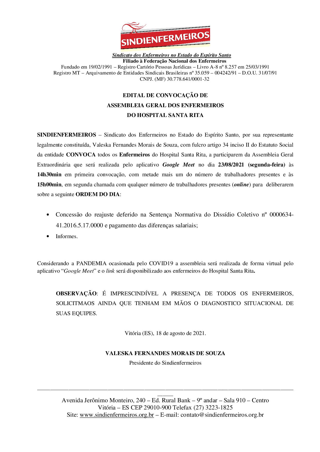 SINDIENFERMEIROS – Sindicato dos Enfermeiros no Estado do Espírito Santo, por sua representante legalmente constituída, Valeska Fernandes Morais de Souza, com fulcro artigo 34 inciso II do Estatuto Social da entidade CONVOCA todos os Enfermeiros do Hospital Santa Rita, a participarem da Assembleia Geral Extraordinária que será realizada pelo aplicativo Google Meet no dia 23/08/2021 (segunda-feira) às 14h30.