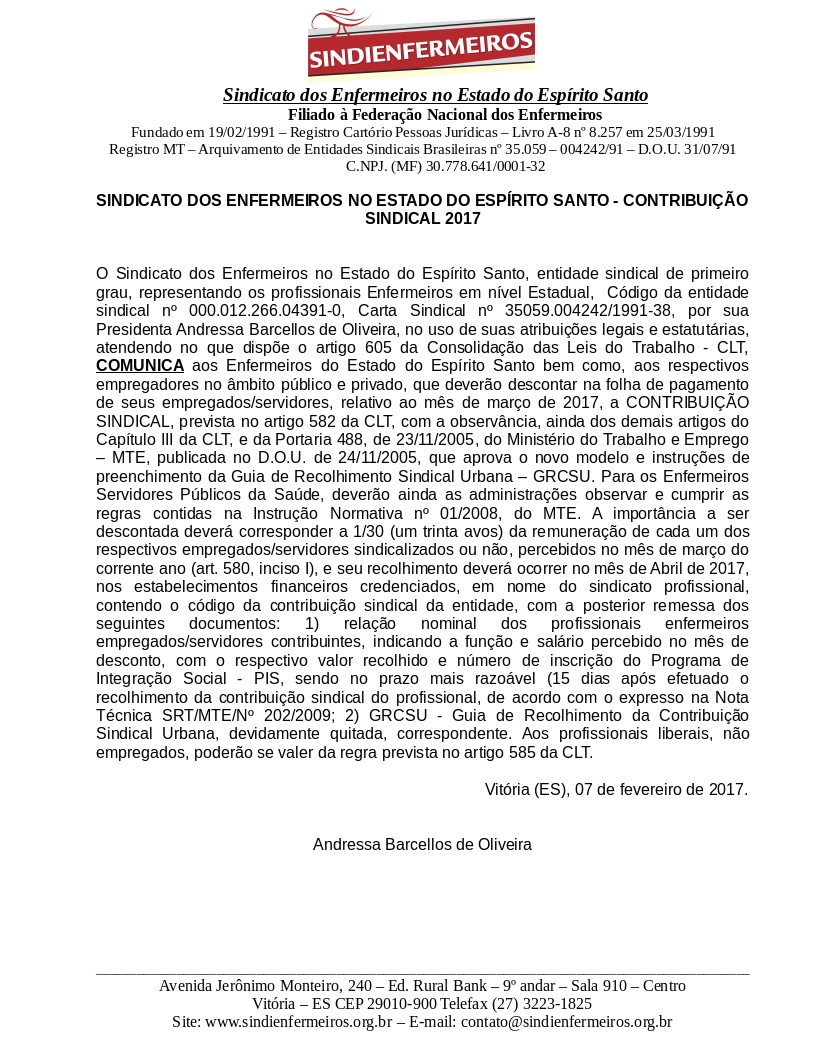 O Sindicato dos Enfermeiros no Estado do Espírito Santo, entidade sindical de primeiro grau, representando os profissionais Enfermeiros em nível Estadual,  Código da entidade sindical nº 000.012.266.04391-0, Carta Sindical nº 35059.004242/1991-38, por sua Presidenta Andressa Barcellos de Oliveira, no uso de suas atribuições legais e estatutárias, atendendo no que dispõe o artigo 605 da Consolidação das Leis do Trabalho - CLT, COMUNICA aos Enfermeiros do Estado do Espírito Santo.